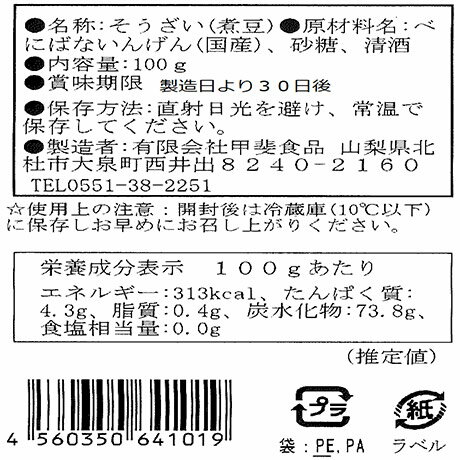 商品説明原材料名べにばないんげん、砂糖、清酒 名称惣菜(煮豆)原料原産国国産(山梨県、長野県)内容量100g賞味期限 別途商品ラベルに記載製造日より30日後保存方法直射日光を避け、常温で保存してください。
