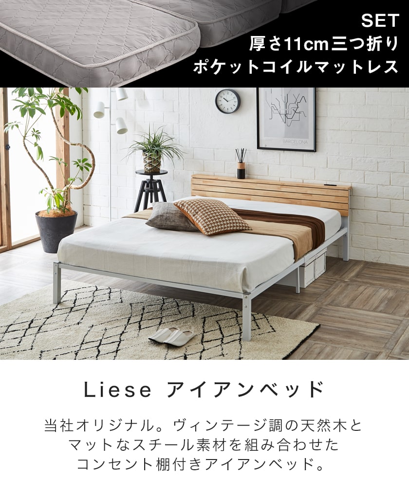 リーセ ヴィンテージ調アイアンベッド 厚さ11cm三つ折りポケットコイルマットレスセット セミダブル 棚付きベッド コンセント 黒 ブラック ベッド おしゃれ マットレス付き セミダブルサイズ セミダブルベッド 宮付きベッド 脚付きベッド 新商品