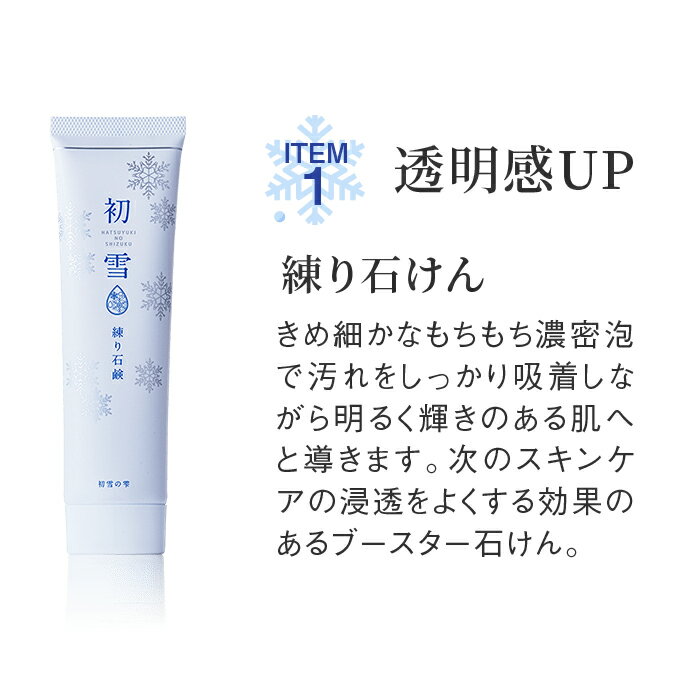 商品詳細(初雪の雫練り石鹸) 初雪の雫練り石けんは、マリンシルト配合のきめ細かなもちもち濃密泡で汚れをしっかり吸着しながら明るく輝きのある肌へと導きます。