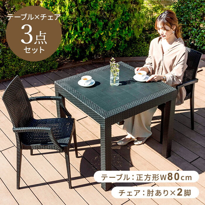 ガーデンテーブル 80×80cm・チェア2脚セット LA・TAN | おしゃれ 屋外 庭 ガーデンチェア ガーデン テーブル セット 雨ざらし ガーデンテーブルセット ラタン バルコニー チェア 椅子 テラス テーブルセット ガーデンファニチャー 2人 バーベキュー ウッドデッキ カフェ風