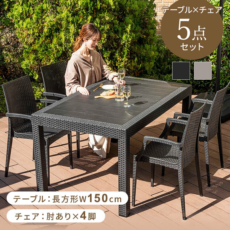 【12H限定P5倍!8/30 12:00〜23:59】ガーデンテーブル チェア 5点セット ラタン 調 幅150cm テーブル 肘ありチェア 水洗い 庭 ガーデニング バルコニー ガーデン家具 ベランダ おしゃれ 家具 屋外家具 外用テーブル 送料無料
